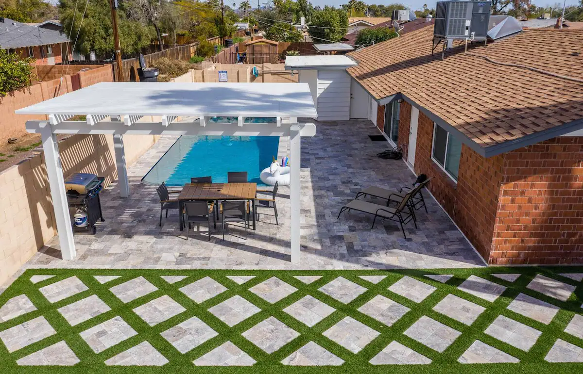 Our backyard space, just refinished with synthetic grass and travertine, features a beautiful pool with brand new mini pebble coating.