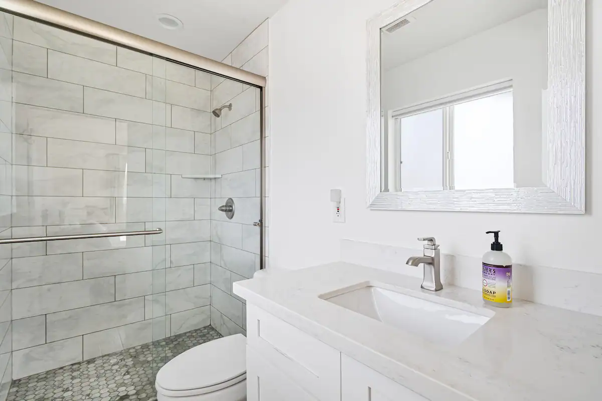 Hall bathroom with jetted bathtub/shower